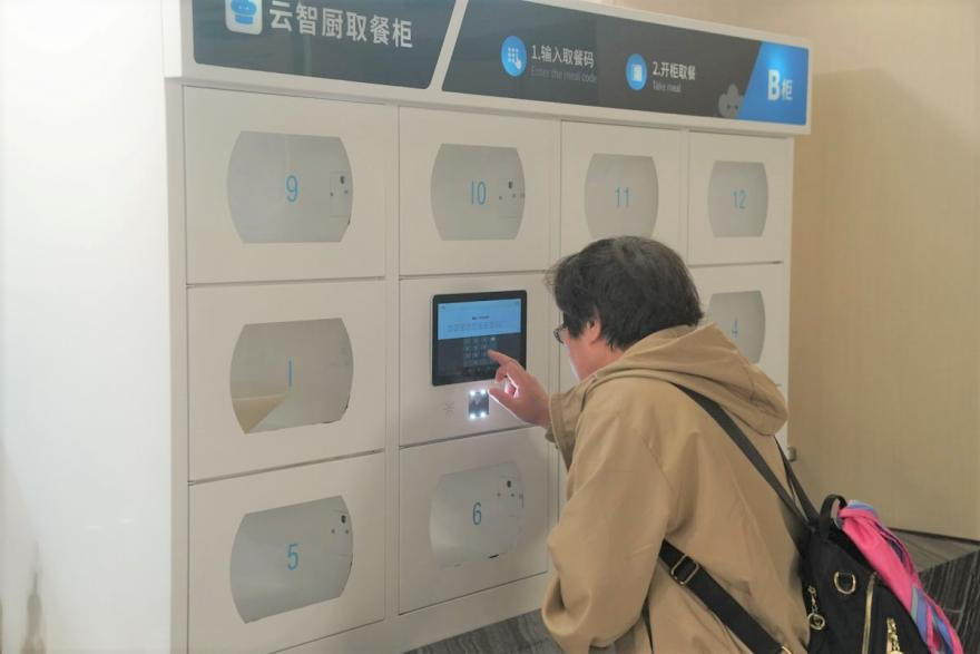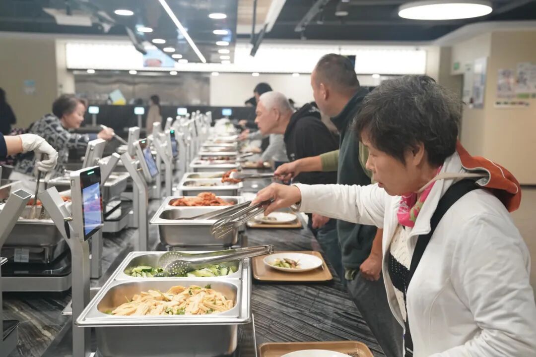 更亮眼的是全國首創的智能混合餐線,小碗菜、稱重菜、單點菜“一站式”配齊,還能“像取快遞一樣掃碼取餐”。張阿姨經常在這里點一份3.5元的蘇式面,她介紹道,“點餐后不用排隊取餐,只需留意現場屏幕或個人手機上的取餐提醒,輸入取餐碼餐柜門就打開了,對老年人非常友好。”