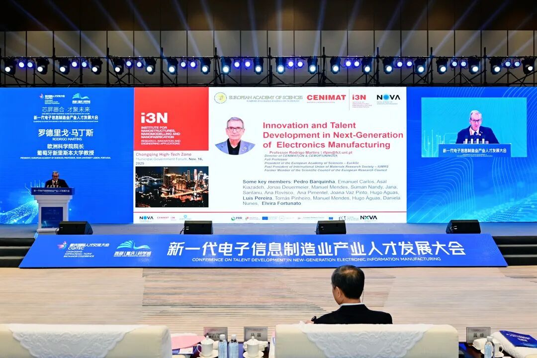 Rodrigo Martins發表“新一代電子信息制造業創新與人才培養”主旨報告。他表示,重慶在電子信息產業領域的戰略布局與創新生態建設令人矚目,歐洲科學院中國中心項目的簽約落地,將成為中歐人才交流與技術轉化的重要橋梁。會上,Rodrigo Martins還分享了透明電子、紙電子等可持續技術的發展成果,強調通過綠色材料研發與低碳制造工藝,將助力產業實現生態與效益的雙向共贏。