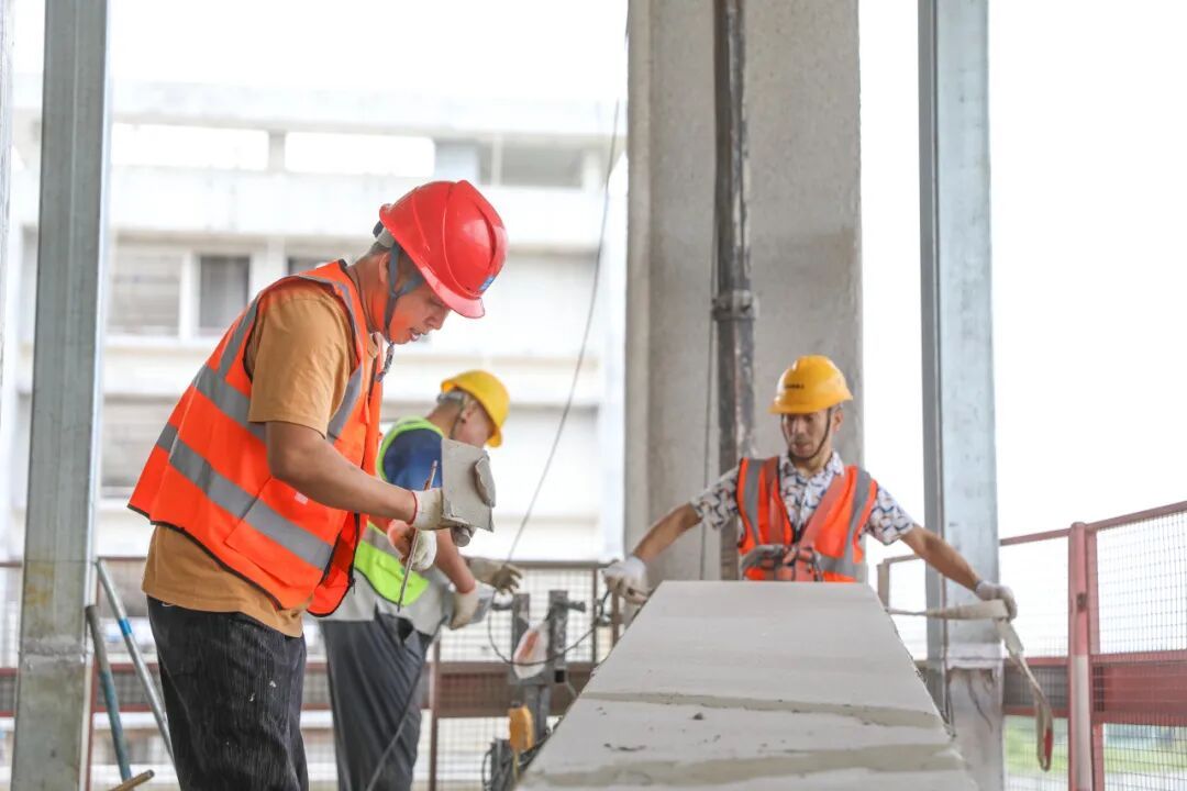 在項目建設現場,多輛登高車、挖掘機等機械來回作業,180余名工人在各個作業面上施工,正緊鑼密鼓地進行玻璃幕墻、室內精裝修、園林綠化等工作,一派繁忙。自項目正式建設以來,核心團隊堅持“節假日不停工”錨定目標忙生產,結合項目特點,樹立快速建造、優質履約的理念,認真編制各種施工方案,堅持設計引領、技術先行,使得項目整體進度、施工質量、文明施工等全處于受控狀態。