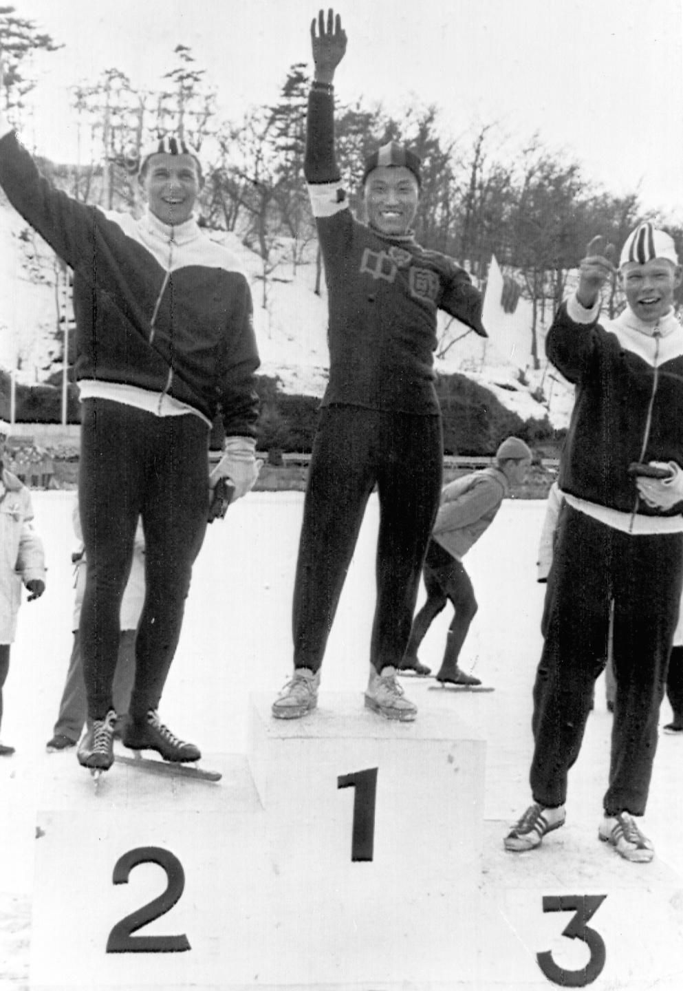 1963年2月24日,在日本舉行的世界速度滑冰錦標賽中,羅致煥獲得男子1500米項目冠軍。這是中國運動員第一次取得冰雪項目的單項世界冠軍。圖為羅致煥(中)受獎后向觀眾致意。 新華社發(資料照片)