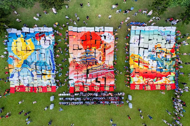 10月1日,在香港中山紀念公園,180余所學校的約千名師生家長共同拼出3幅巨型拼圖:愛我中華、富強盛世、心系祖國。新華社發(受訪者供圖)