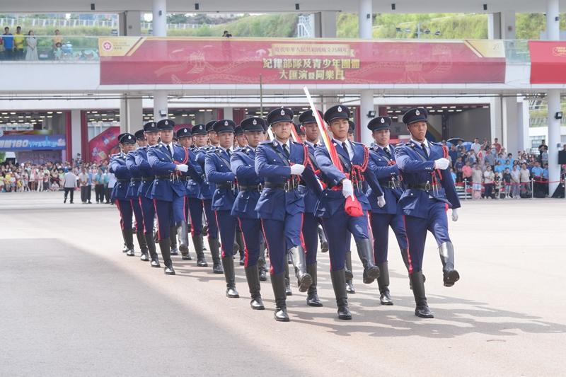 10月1日,香港紀律部隊連同青少年制服團體在消防及救護學院舉行升旗禮及匯演。圖為紀律部隊儀仗隊及青少年制服團體以中式步操進場。新華社發(香港特區政府供圖)