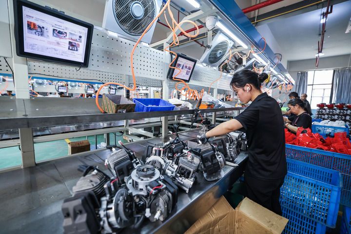 2024年8月14日,在浙江省金華市金東區曹宅鎮的浙江托馬斯工具制造有限公司數字化車間內,工人在流水線上生產出口的園林機械。近年來,金華市金東區大力推動數字化改造,聚焦智能家居、電動(園林)工具等主導行業,以場景應用帶動“智改數轉網聯”項目建設。新華社記者 徐昱 攝
