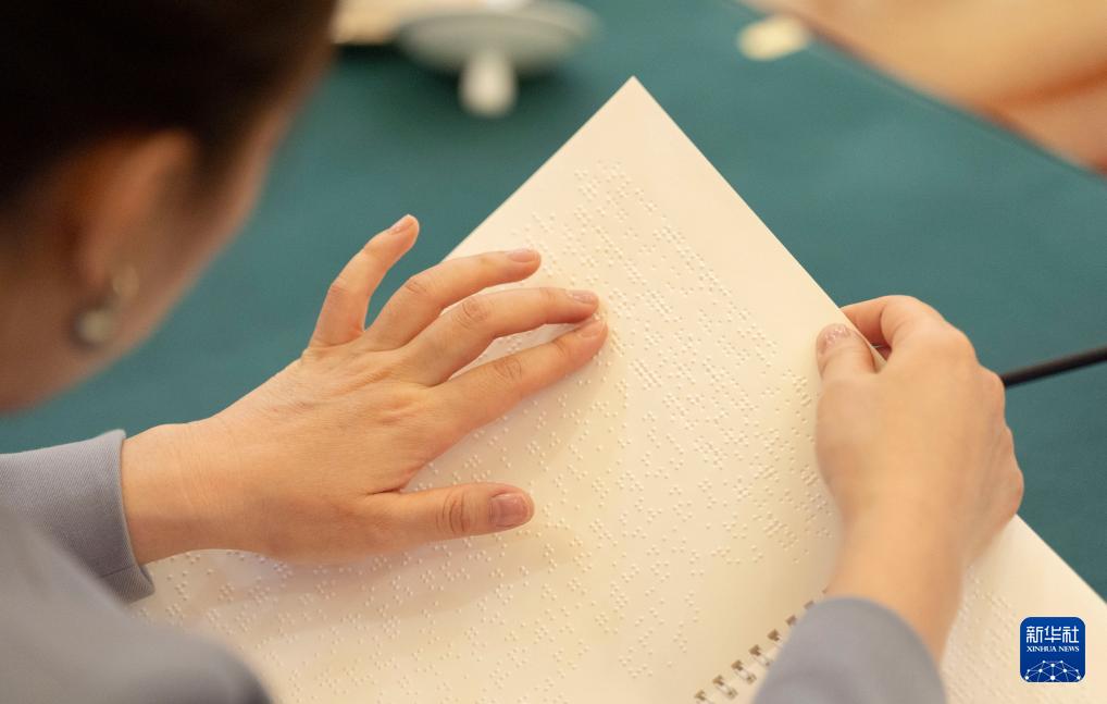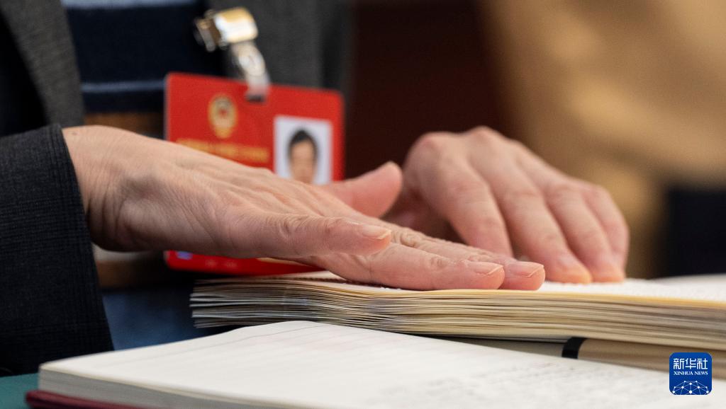 3月5日,在全國政協十四屆三次會議社會福利和社會保障界別小組會議現場,政協委員觸摸盲文版政府工作報告。