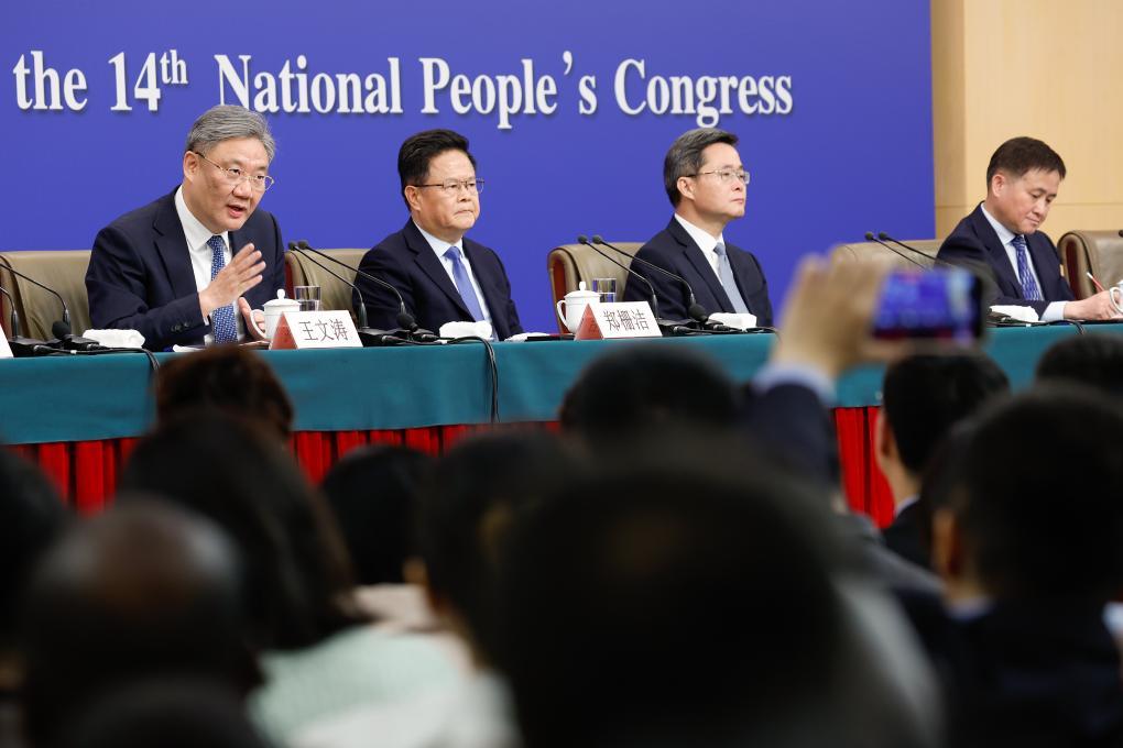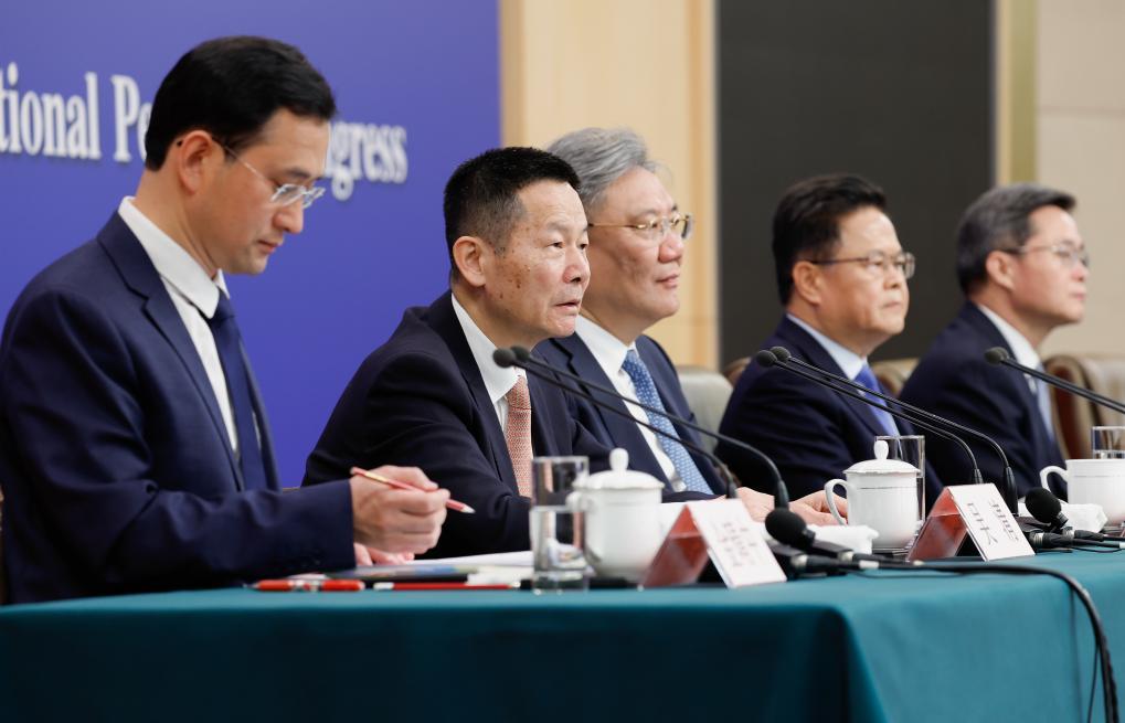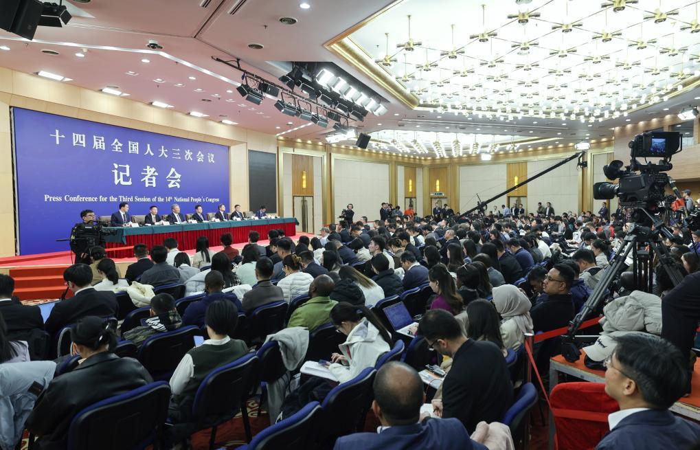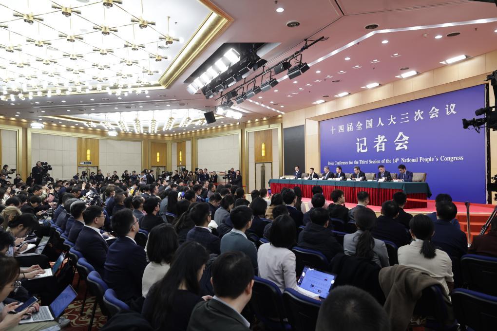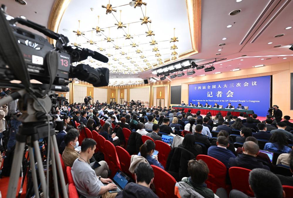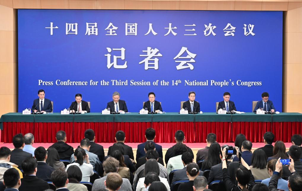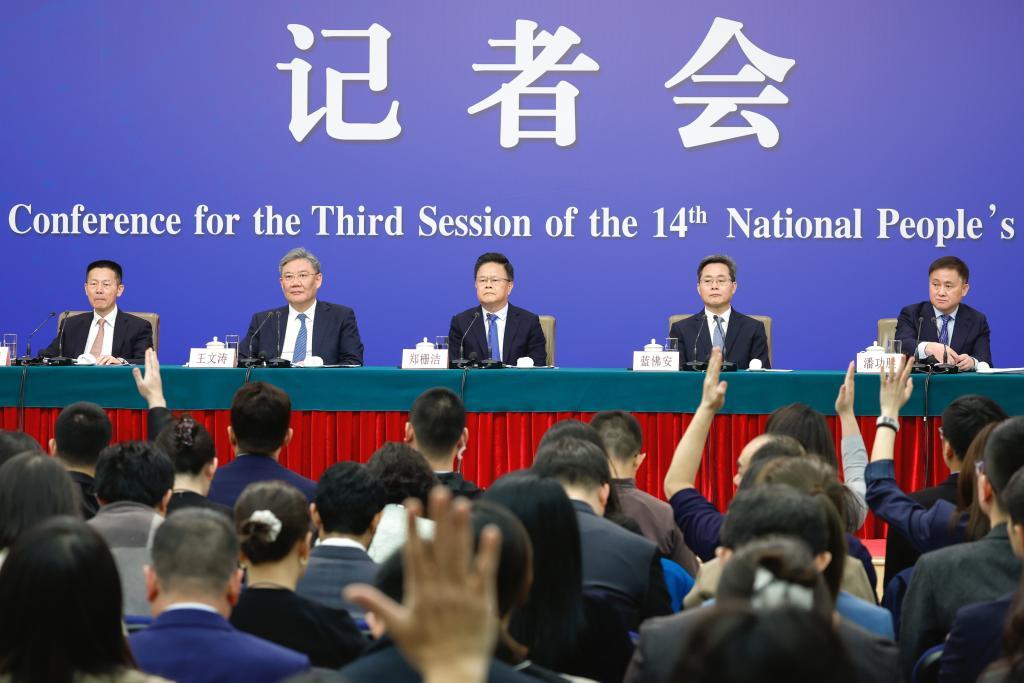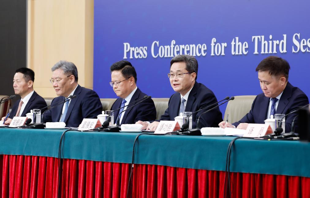 3月6日,十四屆全國人大三次會議在北京梅地亞中心新聞發布廳舉行記者會。國家發展和改革委員會主任鄭柵潔、財政部部長藍佛安、商務部部長王文濤、中國人民銀行行長潘功勝、中國證券監督管理委員會主席吳清就發展改革、財政預算、商務、金融證券等相關問題回答中外記者提問。