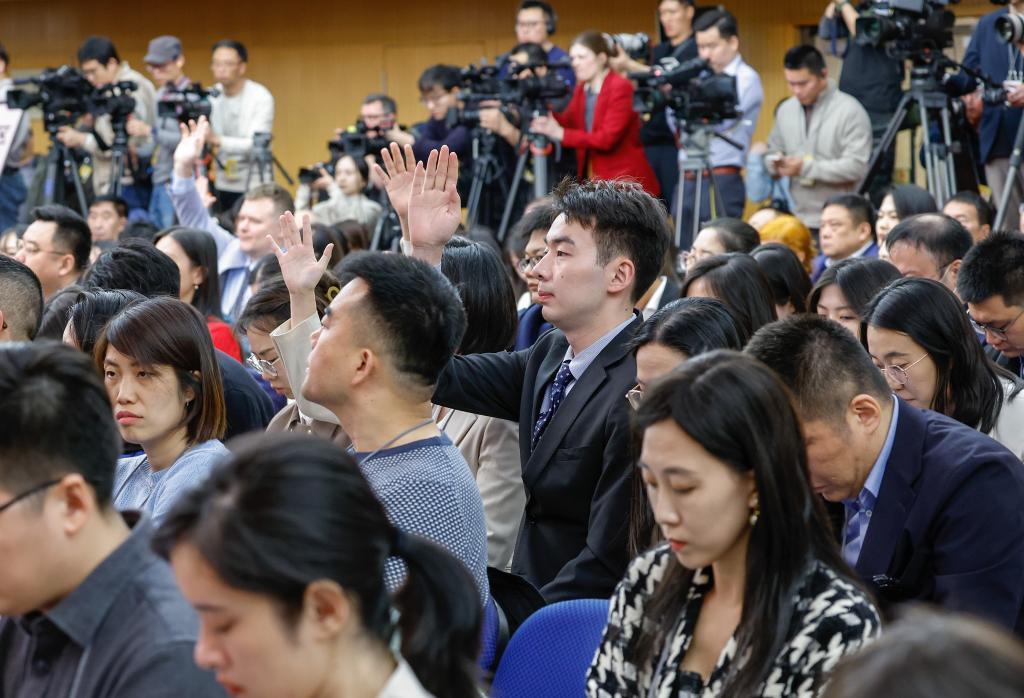 3月6日,十四屆全國人大三次會議在北京梅地亞中心新聞發布廳舉行記者會。國家發展和改革委員會主任鄭柵潔、財政部部長藍佛安、商務部部長王文濤、中國人民銀行行長潘功勝、中國證券監督管理委員會主席吳清就發展改革、財政預算、商務、金融證券等相關問題回答中外記者提問。這是記者舉手提問。