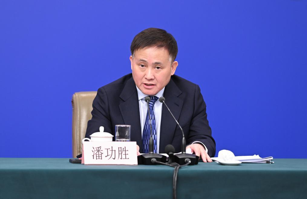 3月6日,十四屆全國人大三次會議在北京梅地亞中心新聞發布廳舉行記者會。國家發展和改革委員會主任鄭柵潔、財政部部長藍佛安、商務部部長王文濤、中國人民銀行行長潘功勝、中國證券監督管理委員會主席吳清就發展改革、財政預算、商務、金融證券等相關問題回答中外記者提問。這是潘功勝在回答記者提問。