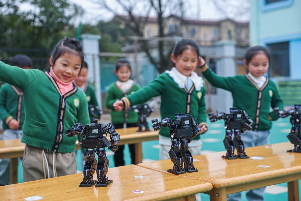 2025年2月19日,浙江諸暨市暨南街道南悅幼兒園的孩子們在拓展課程上觀看機器人舞蹈。新華社記者 徐昱 攝