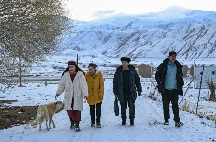 2025年1月3日,全國人大代表多來提曼·開米克(右二)在新疆塔什庫爾干塔吉克自治縣瓦恰鄉(xiāng)夏布孜喀拉村走訪。新華社記者 陳朔 攝