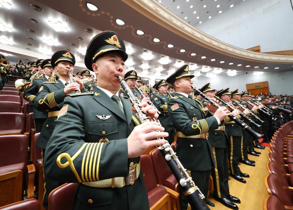 3月11日,十四屆全國人大三次會議在北京人民大會堂舉行閉幕會。這是軍樂團在演奏。