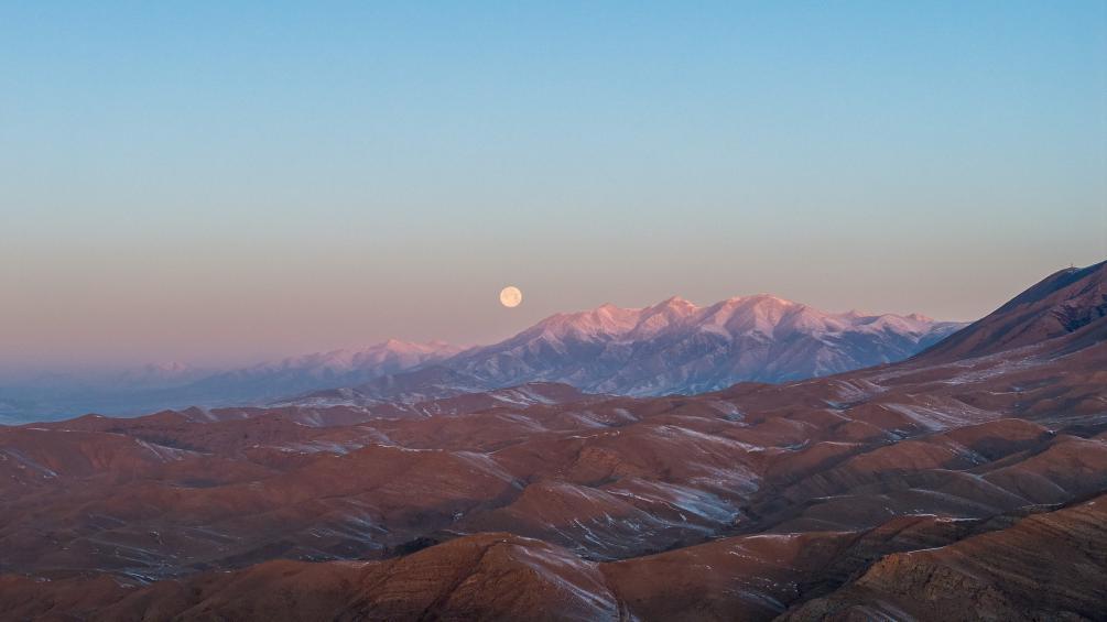 這是1月14日在新烏鞘嶺隧道附近拍攝的山脈與月亮(無人機照片)。新華社記者 郎兵兵 攝