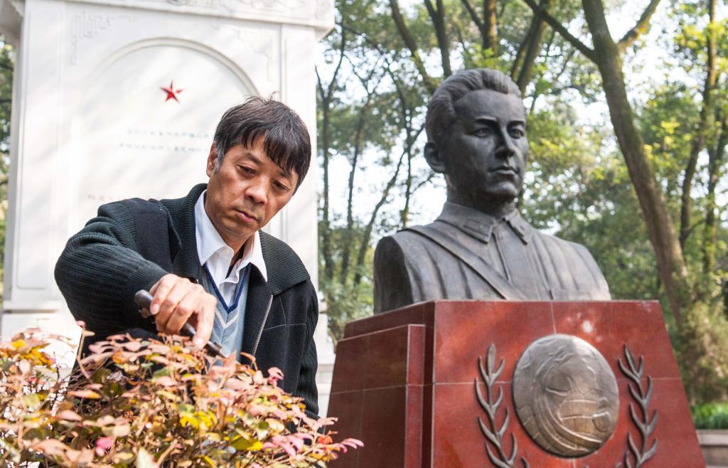 2014年11月19日,守陵人魏映祥在庫里申科烈士陵園內庫里申科烈士雕像前修剪陵園內的苗木。新華社記者 劉潺 攝