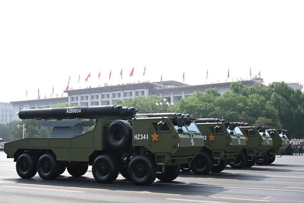 9月3日,紀念中國人民抗日戰爭暨世界反法西斯戰爭勝利80周年大會在北京隆重舉行。這是水下兵器方隊接受檢閱。新華社記者 張鋮 攝