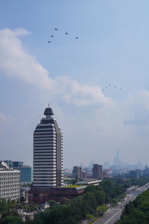 9月3日,紀念中國人民抗日戰爭暨世界反法西斯戰爭勝利80周年大會在北京隆重舉行。這是市民在拍攝空中梯隊。新華社記者 陳浩明 攝